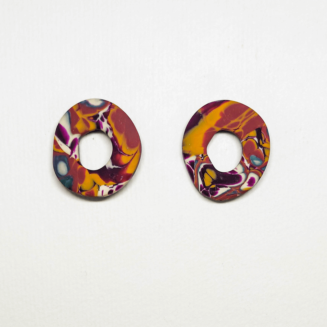 O Âmbar da Aurela Studio é feito à mão com cerâmica plástica, garantindo uma peça leve e confortável. Seu visual exclusivo traz uma arte colorida e vibrante que se destaca no look.
